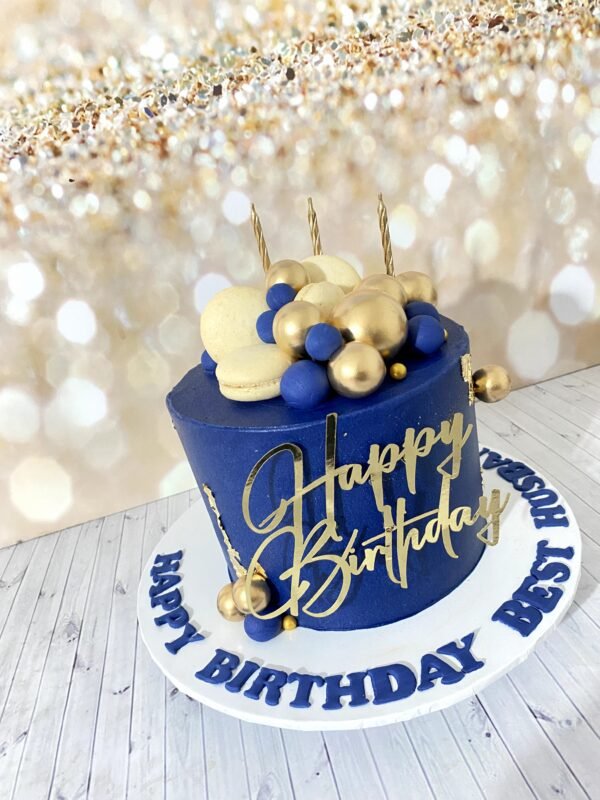Be the first to review “Blue & Gold Cake with Macarons & Faux Balls”