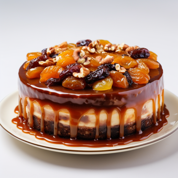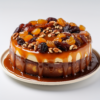 The Chocolate Delight Cake features a luscious vanilla base generously infused with chocolate chips, complemented by the delightful combination of cashews, dates, and raisins. To elevate the experience, a rich layer of caramel crowns this indulgent creation.