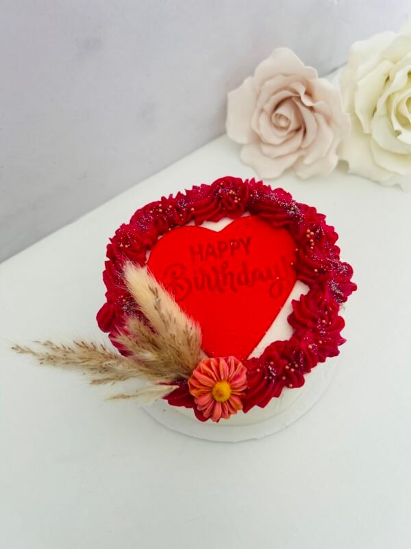 Celebrate in style with our exquisite white cake, adorned with a luscious red buttercream finish. The heart-shaped fondant tag, wishing a “Happy Birthday,” adds a touch of sentiment to your special day. To enhance the elegance, we’ve tastefully incorporated delicate dry flowers, creating a visually enchanting and delicious masterpiece. Make your celebration memorable with this delightful blend of flavors and aesthetics.