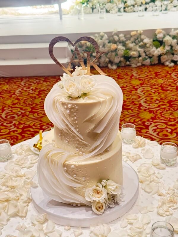 Design: Smooth ivory finish with delicate edible pearl accents, flowing fondant drapes, and fresh white roses for a romantic touch