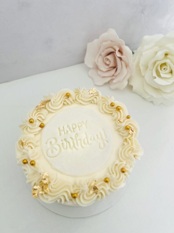 Indulge in the allure of our 300g, 4-inch white and gold mini cake, elegantly cloaked in a velvety white buttercream. This sophisticated treat promises a unique and indulgent experience, combining rich flavor with a sleek and stylish presentation. Elevate your celebrations with this chic dessert that’s as visually striking as it is delicious.